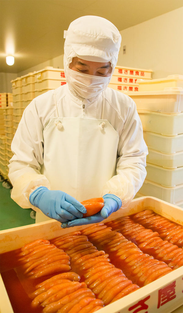 福さ屋の明太子は、すべて、この確かな目と技で選び抜かれた「真子」だけを使用しています。